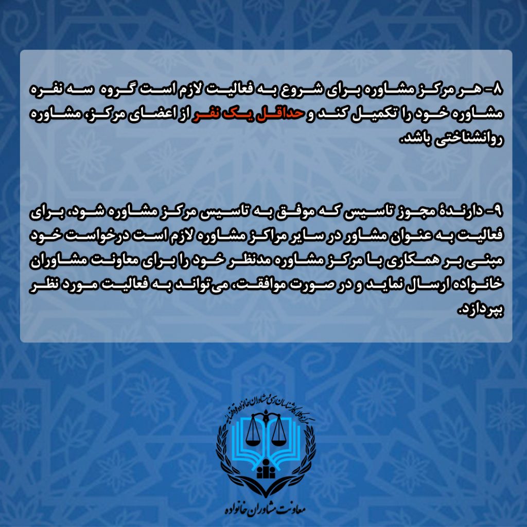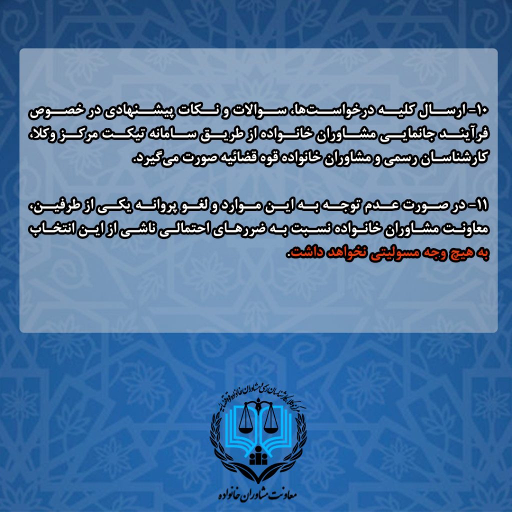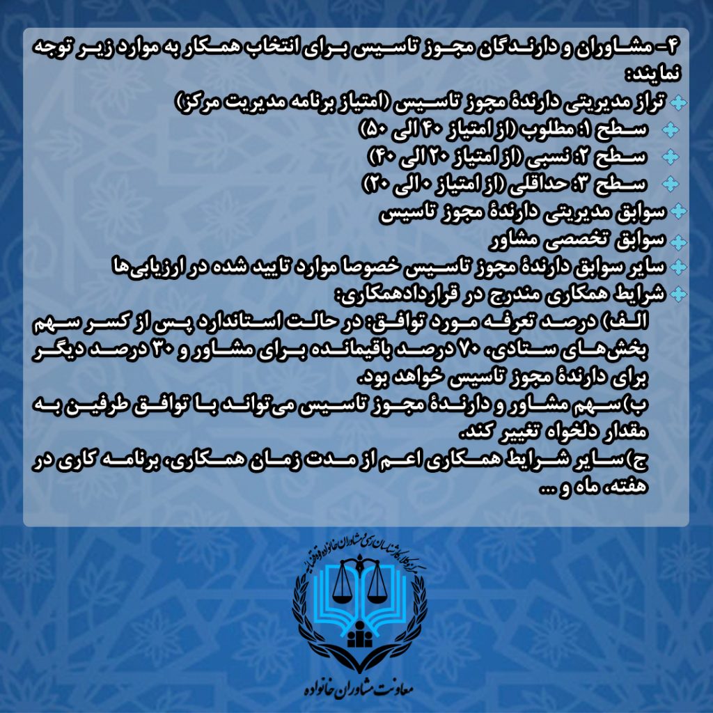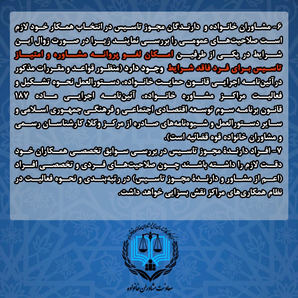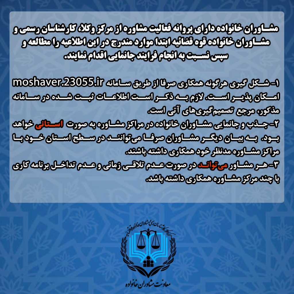 مشاوران خانواده دارای پروانه فعالیت مشاوره از مرکز وکلا، کارشناسان رسمی و مشاوران خانواده قوه قضائیه لازم است با دقت اطلاعیه فوق را مطالعه نمایند و سپس نسبت به انجام فرآیند جانمایی در سامانه جانمایی مشاوران خانواده قوه قضائیه به آدرس moshaver.23055.ir تا روز دوشنبه مورخ۲۷ دی اقدام نمایند.