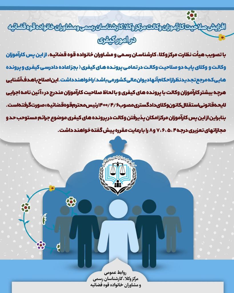 با تصویب هیأت نظارت مرکز وکلا، کارشناسان رسمی و مشاوران خانواده قوه قضائیه، از این پس کارآموزان وکالت و وکلای پایه دو صلاحیت وکالت در تمامی پرونده های کیفری (بجز اعاده دادرسی کیفری و پرونده هایی که مرجع تجدیدنظر از ...
