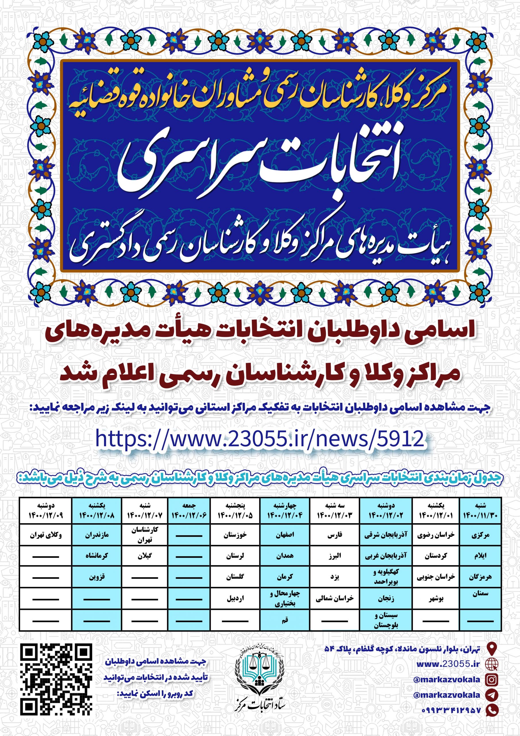 مشاهده۱.لیست زیر را دانلود کنید ۲.در صورت مشخص شدن اسم شما در لیست در تاریخ ۱۴۰۰/۱۲/۲۴ به مرکز کارشناسان رسمی دادگستری استان البرز مراجعه نمایید. دانلود لیست ( نسخه پی دی اف) آدرس مرکز : کرج،بلوار طالقانی شمالی،حد فاصل پل آزادگان تا میدان طالقانی ...