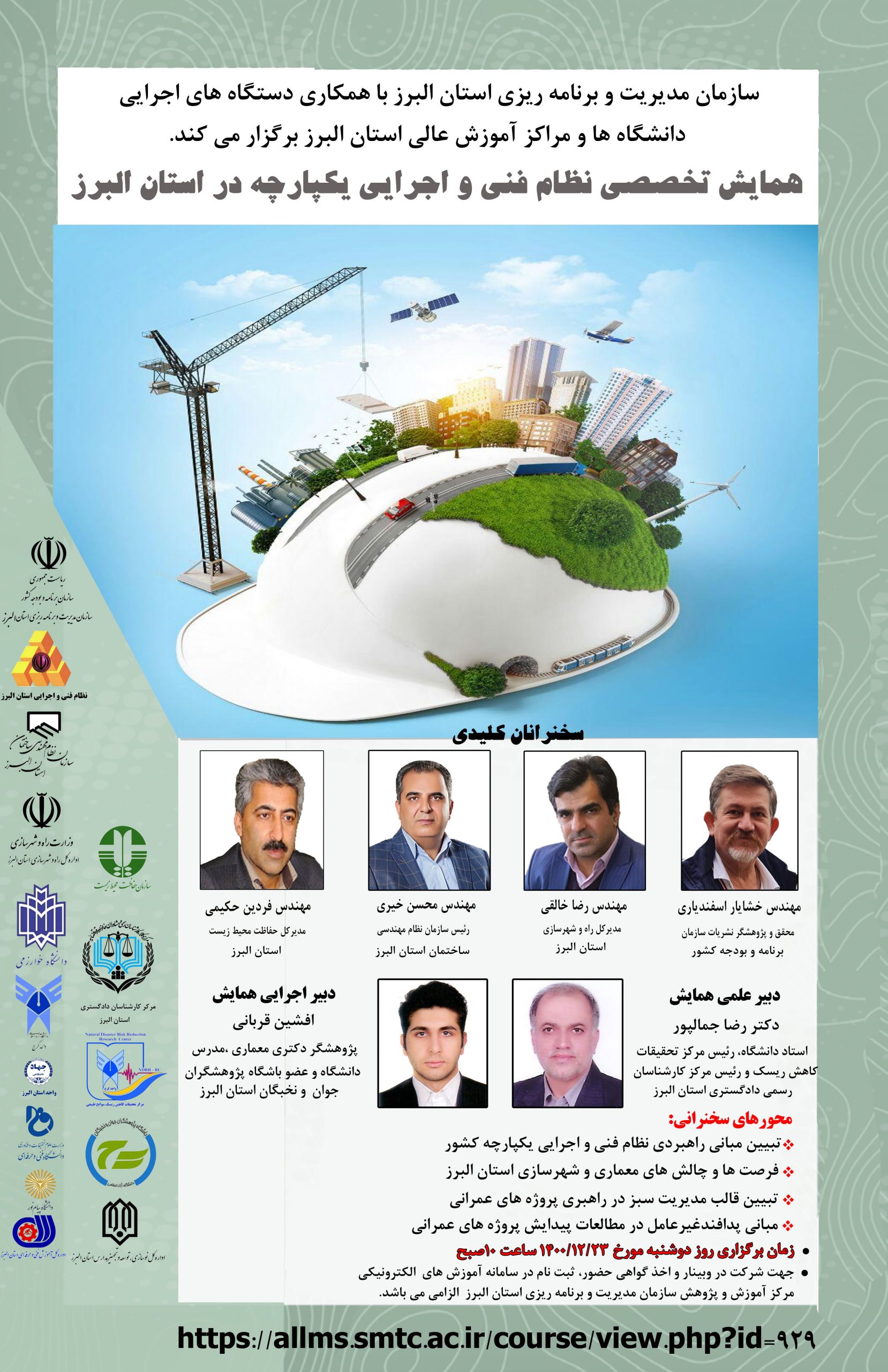 مشاهدهسازمان مدیریت و برنامه ریزی استان البرز با همکاری دستگاه های اجرایی، دانشگاه ها و مراکز آموزش عالی استان البرز برگزار می کند: همایش تخصصی نظام فنی و اجرایی یکپارچه در استان البرز با سخنرانی: مهندس رضا خالقیمدیرکل راه و شهرسازی استان البرز مهندس ...
